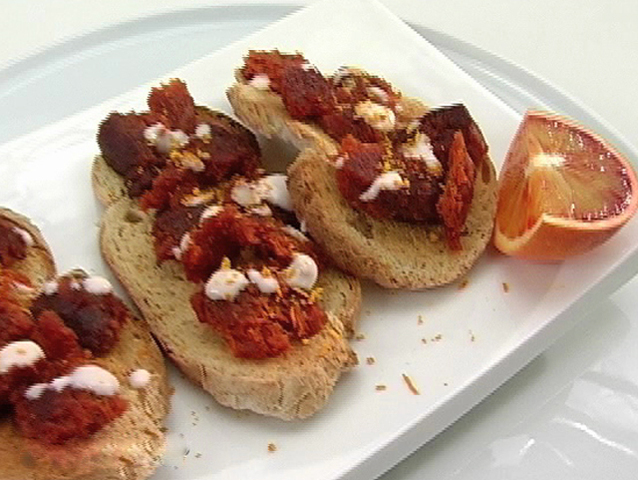 Рецепт приготовления тостов с нежной собрасадой и алиоли.Состав:собрасада — 180 гр;сок половинки апельсина;хлеб — 3 кусочка;алиоли — 4 столовых ложки;цедра апельсина.